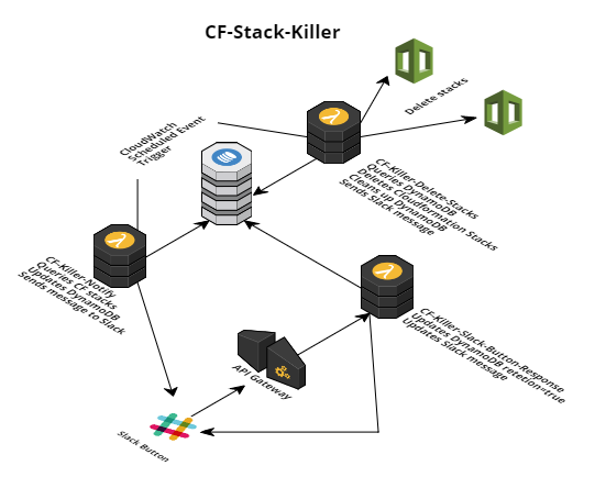 To help alleviate the clutter as well as reduce AWS costs, I decided to create the CF-Stack-Killer, a set of Lambdas that will help remove stacks at the end of the day with a Slack integration containing an interactive message button that allows a user to postpone the stack deletion. The process goes like this: