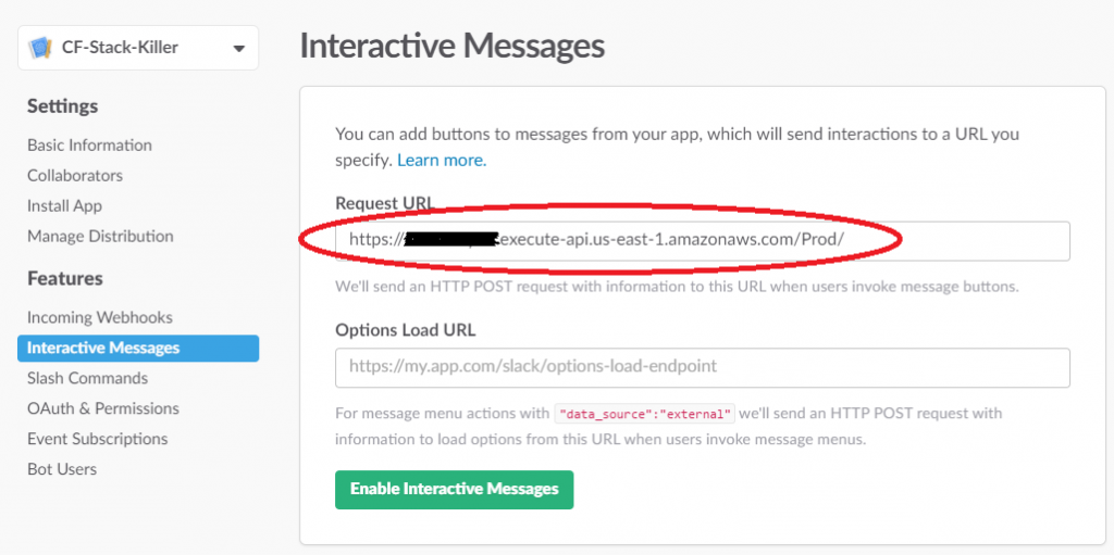 Copy the Invoke URL into the Slack App ->Interactive Messages -> Request URL