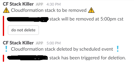 NOTE!! You may want to modify the Slack message that indicates what time the stack will be deleted to your use case:
