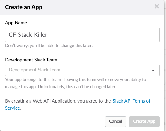 We need to create a Slack App, which allows our Lambdas to communicate to Slack. For more information about making Slack Apps visit this site: https://api.slack.com/slack-apps