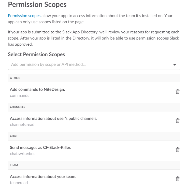Go to the OAuth & Permissions section and provide your application the following permissions: