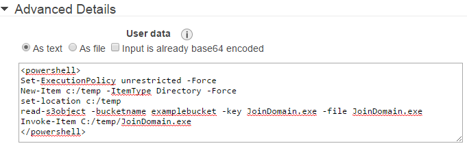 By using the UserData you can run commands. For our case, we will be executinig an EXE to join to the domain.